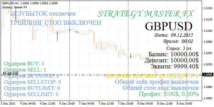 В конструкторе советников Strategy Master FX, при разработке и тестировании робота вы сможете видеть все важные показатели хода торговли на Вашем экране. Это позволяет быть всегда вкурсе всего происходящего. Среди информации вы увидите название стратегии, текущий баланс, эквити, просадку, прибыль в текущий момент как в долларах так и в % от депозита, прибыль за все время работы робота, количество выставленных на данный момент ордеров BUY, SELL, BUYSTOP, SELLSTOP, BUYLIMIT, SELLLIMIT. А так же текущую дату и время сервера по которому советник входит в рынок и прекращает торговлю (при настройках с указанием времени). Полную информацию о безубытке, а так же о локировании в случае возникновения лока. Всю выводимую графику можно как включать так и выключать и настраивать.