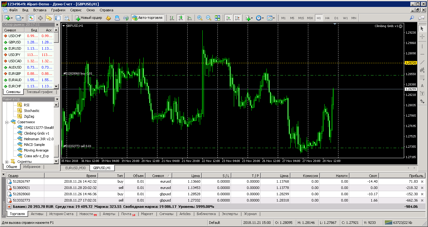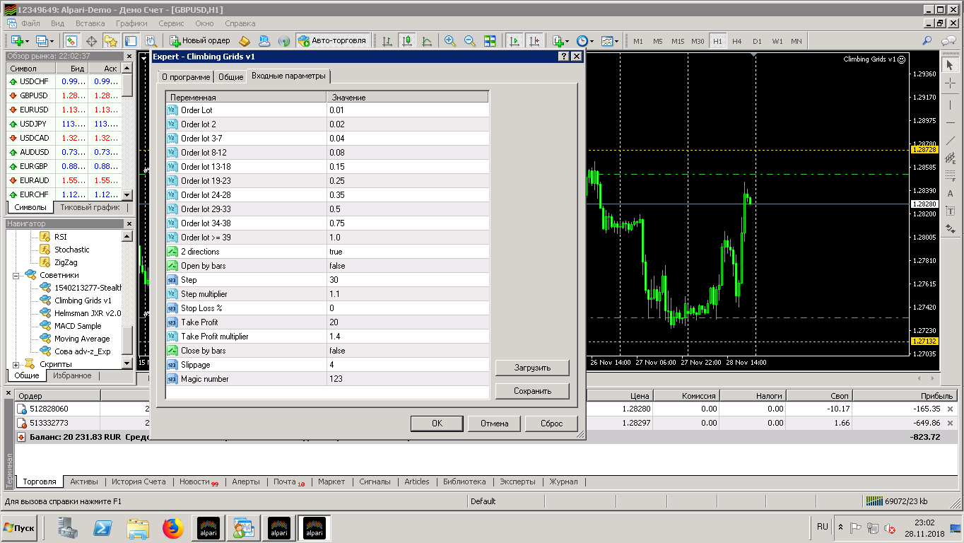 Советник имеет сеточный алгоритм, дающий возможность строить как сетку из бай и селл ордеров одновременно, так и по раздельности. Преимущества данного робота в том, что он позволяет задавать лот для каждых 5 последующих ордеров. То есть, лот увеличивается очень плавно, и каждые 5 ордеров набирают лотность не по автоматическому множителю, а из заданных Вами настроек. Например, 1 ордер имеет лот 0,01, второй 0,02, затем 5 ордеров лотом 0,03, а далее 5 ордеров лотом 0,05, или 0,04. Это позволяет избежать больших просадок и отлично сохраняет депозит, при резких скачках рынка.