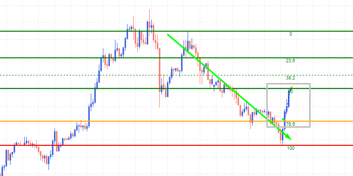 Строится Фибо сетка, для входа в рынок советник ждет отката от уровня 100, до уровня 78.6. После того, как цена вышла за уровень 78.6 (проверяется цена открытия сформировавшегося бара. Она должна быть между уровнями 100 - 78.6, тело же должно быть ниже уровня 78.6). Если условия открытия совпадают - открывается ордер на продажу. Стоп лосс на уровне 100, тейк профит на уровне 50. При включении мартингейла каждый ордер, после убыточного, открывается с увеличенным лотом.