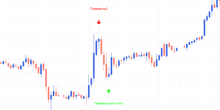 Падающая звезда и повешенный - предрекают поворот восходящего тренда, который был до образования этих фигур. Все эти фигуры имеют небольшое тело, длинную тень с одной стороны и короткую (либо вовсе отсутствующую) тень - с другой.